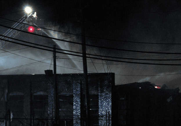 The flames reached over 40 feet high, making it difficult to extinguish the fire. Formerly a Jockey clothing manufacturing plant, the building more recently housed a popular flea market. Occupancy details at the time of the fire were lacking.