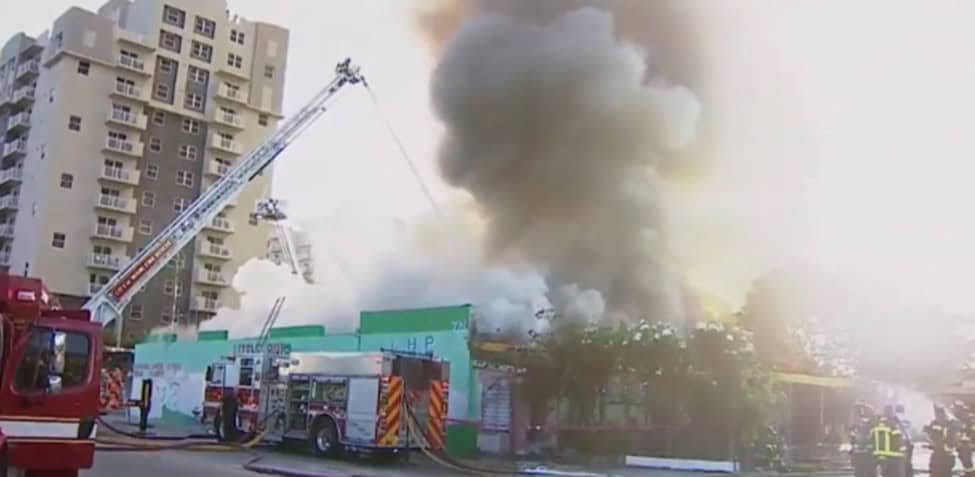 Early Friday morning, May 30th, there was a fire at a vacant Miami warehouse formerly known as the Little River Building and Home Supplies, located at NE 2nd Avenue and 78th Street. Firefighters arrived on the scene within minutes of the call, upgrading it to a Code One working fire. They initially entered the building to fight the blaze and search for any occupants. As the fire grew more intense and concerns increased over a possible structural collapse, crews transitioned to an exterior attack utilizing aerial units and hose lines. The fire took several hours to control. Firefighters avoided civilian injuries, but they took one of their own to the hospital for heat exhaustion and a back injury. Authorities closed neighboring roads until they determined the area was safe, and they urged nearby residents to keep all doors and windows shut.