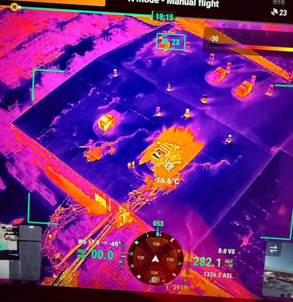 To improve situational awareness, the Oelwein Public Safety drone team deployed an unmanned aerial system equipped with thermal imaging. The drone provided real-time thermal data, allowing crews to identify hotspots beneath the roofing surface and confirm when concealed fire areas had cooled.