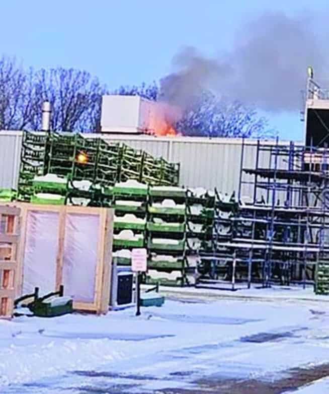 Flames and smoke rise from the roofline of Ashley Industrial Molding as crews respond to the winter industrial fire in Oelwein, Iowa.