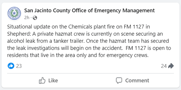 The exact cause of the initial blaze remains under investigation. Initial reports from a preliminary investigation presume the explosion happened when an employee noticed a container leaking with chemicals and tried to use a forklift to lift the container, after which there was ignition. “We have preliminary investigations done on what initially happened, but we want to verify everything,” said Geoff Harfield, president of Sound Resource Solutions. The San Jacinto County Office of Emergency Management posted an update that a private hazmat crew is on the scene securing an alcohol leak from a tanker trailer.