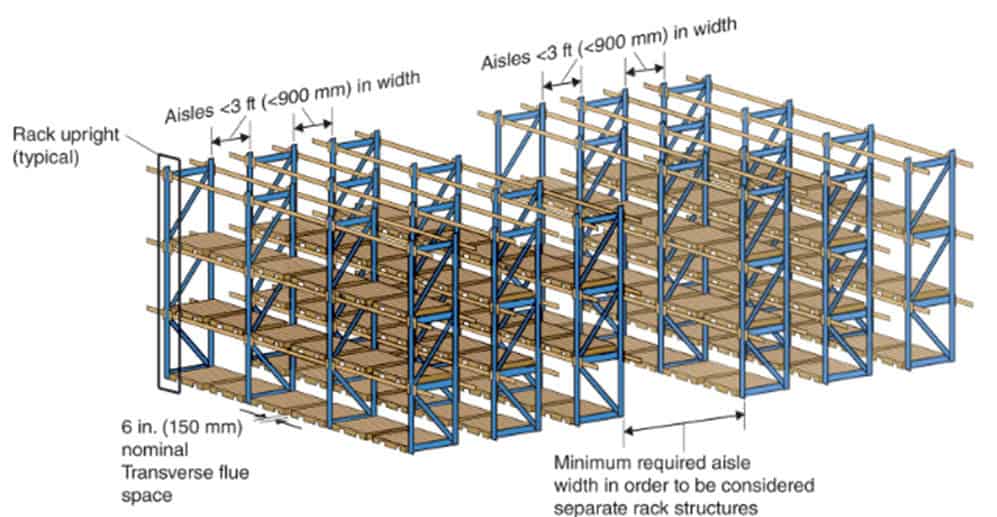 Racks are limited to a maximum depth of 20 ft (6.1 m), as defined by a minimum 8 ft (2.4 m) wide aisle, and have minimum 6 in. (150 ) net wide transverse flue spaces a maximum of every 5 ft (1.5 m), as indicated in Figure 2i.