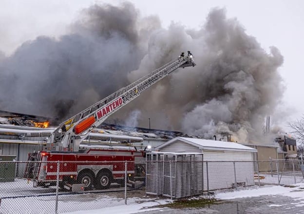 The rural, volunteer paid-on-call fire department could only mount an exterior fire attack due to the risk of collapse of the wood truss roof. Multiple local fire departments provided mutual aid and fought the fire for over nine hours, including several visits the next day to extinguish hot spots. About 75% of the facility was consumed. Videos from local television stations showed no sprinklers installed in the wood roof area. There was no one in the plant at the time of the fire and the cause is under investigation.