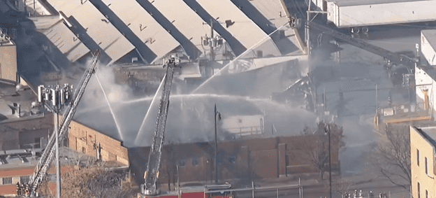 Thursday, November 16th, plumes of smoke filled the air due to a large blaze at an Illinois food processing plant. Over 200 first responders helped battle the three-alarm fire at Evans Food Group, where all employees and surrounding buildings had to be evacuated. The fire started around 8:30 a.m., and within 30 minutes, it spread to the adjacent buildings. Rescuers’ technique was to surround and drown the fire using multiple streams of water onto the 64,000 ft2 building.