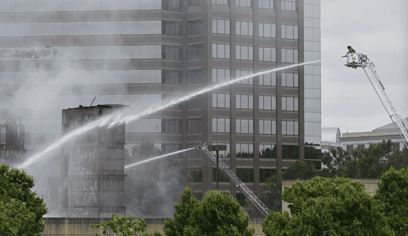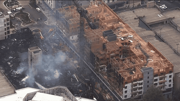 There were concerns about the adjacent building being unstable, and the possibility of a collapse. Exposed wood within the construction site allowed the fire to spread quickly. Firefighters put out hotspots throughout the day and protected the building across the street as embers spread fast.
