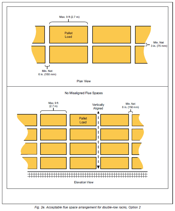 Prior to 2021, FM had not required longitudinal flue spaces in double-row racks to any height; however, if they were provided, they recommended maintaining a minimum net width of 3 in. (75 mm) throughout the vertical height of the rack. Current FM guidance for double-row racks provides two options for required flue widths and spacing, depending on whether the flue spaces are misaligned.