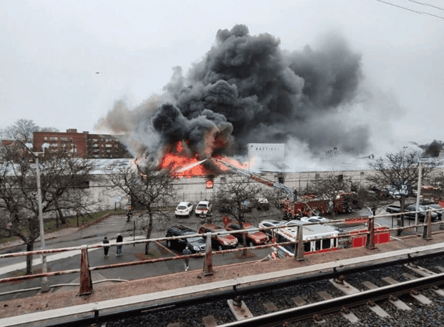 .On Saturday, April 1st a massive five-alarm fire tore through an ambulance repair and service building in Freeport, NY on Sunday, resulting